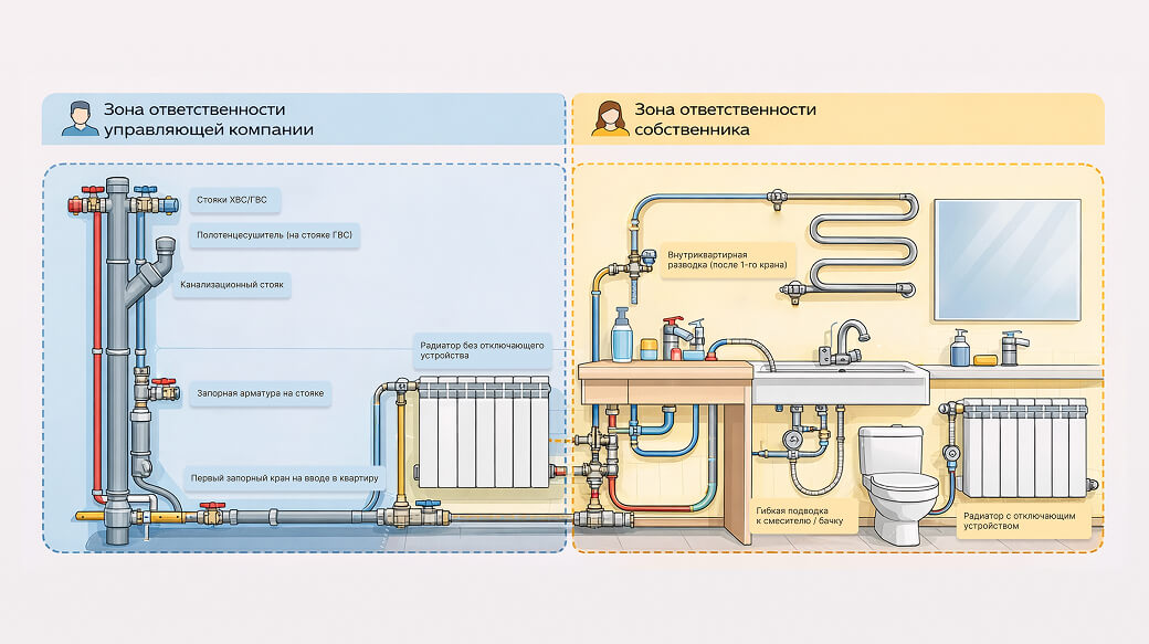 Зона ответственности собственника начинается сразу за первым запорным краном на вводе в квартиру. Всё, что расположено после него, — ваша внутриквартирная разводка: трубы, смесители, гибкие шланги.