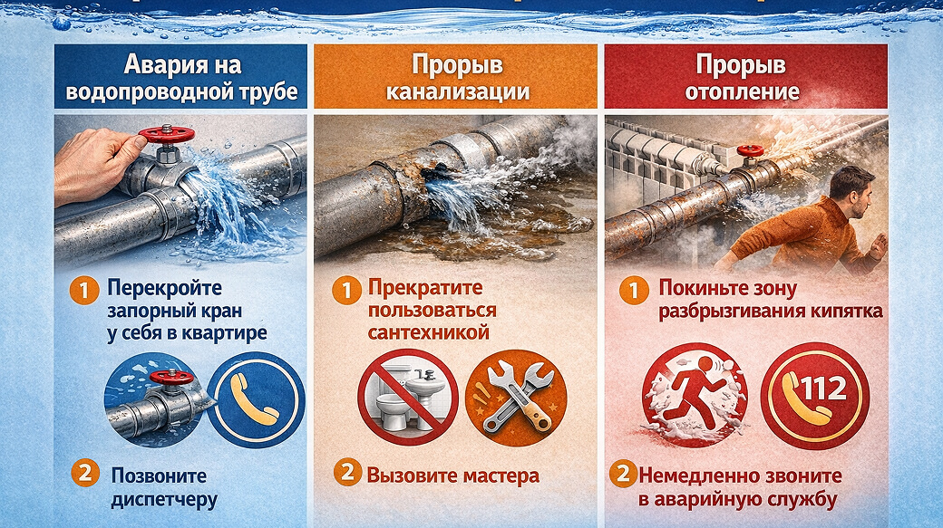 Порядок звонков имеет значение: у каждой службы своя зона ответственности. Куда звонить при прорыве — и в какой последовательности — лучше знать заранее. Экстренный вызов должен последовать сразу после перекрытия воды, держите нужные телефоны под рукой.