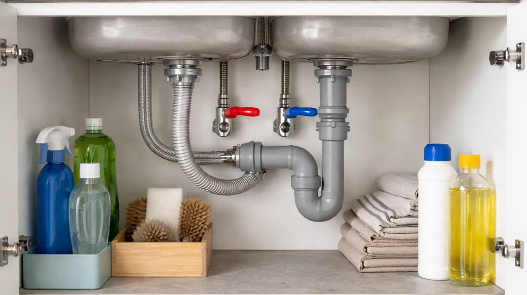 Запорный кран ХВС и ГВС в большинстве квартир стоит в сантехническом шкафу — под раковиной в ванной или на кухне. Найдите шаровой кран с рукояткой-«бабочкой» и поверните её поперёк трубы: водоснабжение в квартире прекратится. Если рукоятка заржавела, используйте разводной ключ — но без чрезмерного усилия, чтобы не сорвать шток.
