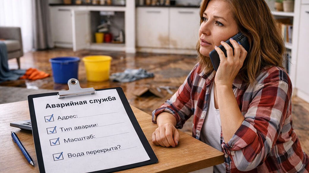 Первый звонок при прорыве — в диспетчерскую службу своей управляющей компании. По закону она обязана принять заявку круглосуточно, без выходных. Диспетчер фиксирует обращение, присваивает номер и направляет бригаду.
